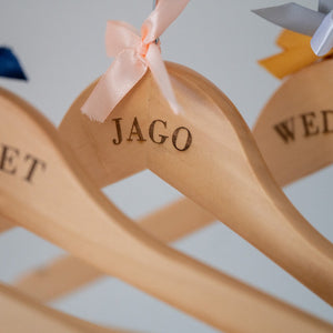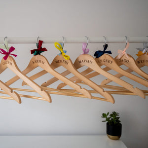 A group of 8 event hangers ideal for wedding outfit organisation and practicality for an Indian wedding. Event names include: Rokha, Chunni, Karmai, Mehndi, Wedding, Jago, Maiyan, Sangeet.